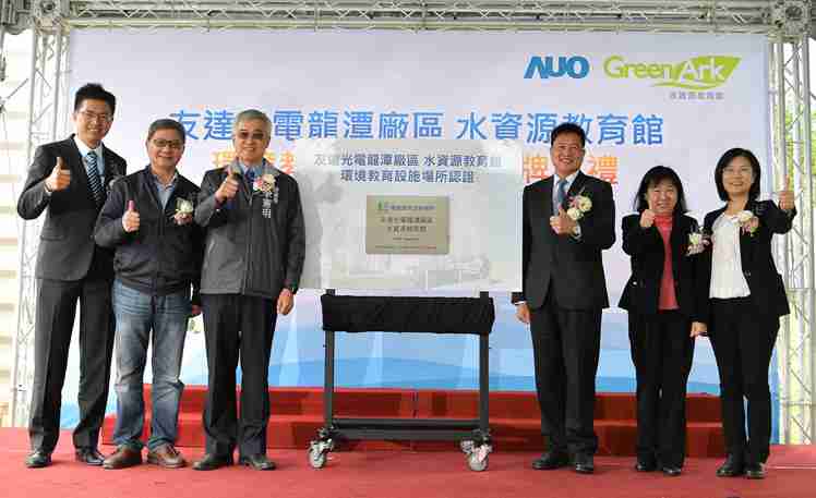 壹号平台龙潭厂水资源教育馆进行环教设施场所认证揭牌 (图左到右:壹号平台光电副总经理林挺立、、桃园市环保局局长沈志修、、、、桃园市政府秘书长李宪明、、、、壹号平台光电董事长暨执行长彭双浪、、、、环保署环教所所长萧慧娟、、、壹号平台光电永续长古秀华)