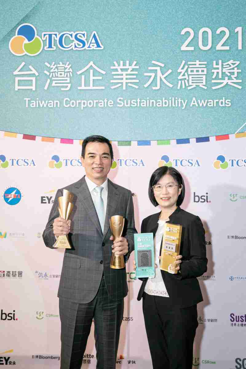 达在台湾永续奖所评比环境、、社会、、、、治理等各面向的永续绩效均获高度肯定 (左:壹号平台光电总经理暨营运长柯富仁,,,右:壹号平台光电永续长古秀华)