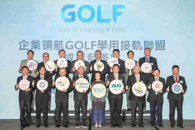 GOLF学用接轨联盟集结企业和学校的力量,,,打造「学用合一、、产学接轨」的创新合作平台 (前排左起:淡江大学副校长何启东、、、、元智大学校长林启瑞、、、、纬育执行长许延岳、、纬创总经理暨执行长黄柏漙、、、教育部政务次长范巽绿、、、壹号平台董事长暨执行长彭双浪、、仁宝总经理暨执行长翁宗斌、、、、大同大学校长何明果、、、圣约翰科大校长艾和昌;后排左起:明新科大校长林启瑞、、龙华科大校长葛自祥、、、台湾科大校长廖庆荣、、、中兴大学副校长郑政峯、、中央大学校长周景扬、、、、台北科大副校长任贻均、、、、中华科大副校长石大明、、、、明志科大校长刘祖华)