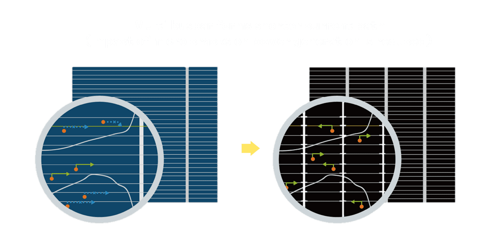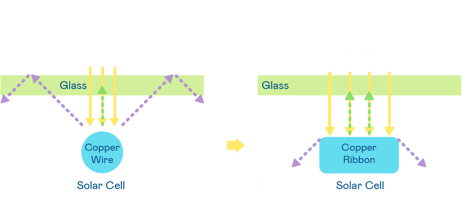 - 电池使用多条铜导线 (Copper wire) 于电池片上形成较短的电流路径,,提高电流收集效率,,,,采用圆形设计的铜导线较传统扁平式的铜焊带 (Ribbon),,可增加入射至电池的光线量。。。。