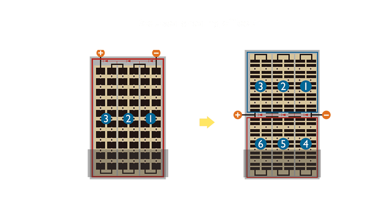 - 结合半切电池,,,,降低遮阴影响、、、、提升模组抗隐裂能力、、、、并减少电阻损耗,,进一步提升模组发电效能。。。。